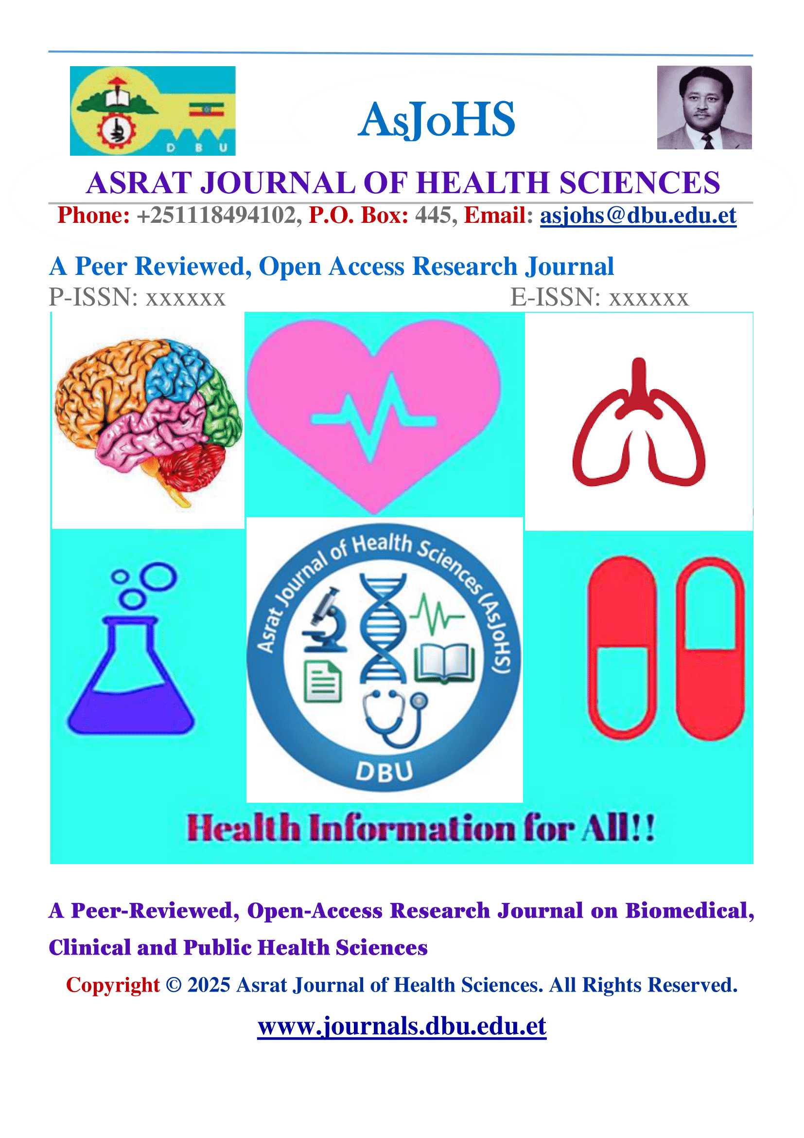 Asrat Journal of Health Sciences (AJoHS) strives to excel in health and biomedical sciences related fields through high quality, evidence based publication of research works for academicians, active researchers, scholars, scientists, managers, policymakers and students. It is expected that AJoHS papers published will give insight that adds to the knowledge of Biomedical, Clinical and Public Health. It is an open-access biannual journal which publishes peer-reviewed articles that significantly contribute to the understanding and improvement of health and the health sciences.